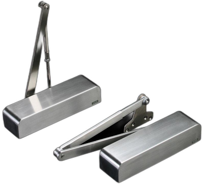 Chiudiporta con carter, braccio piatto e bulloneria completamente in acciaio inox. Categoria: Chiudiporta aerei sovrapposti.