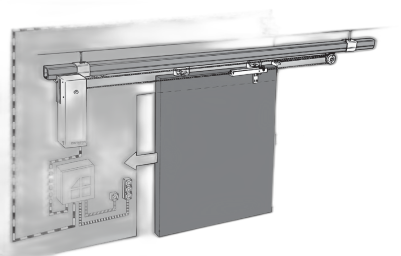 Motorizzazione automatica Dictamat FMB per ante con peso fino a 300 Kg e lunghezza massima di 4 m. Apre e chiude automaticamente portoni scorrevoli antifumo in caso di segnale antincendio, anche senza energia elettrica.