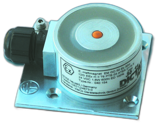Elettromagnete DICTATOR ATEX antideflagrante con cavo 5m. Certificato EX II. Realizzato in Acciaio. Categoria: Elettromagneti ATEX.
