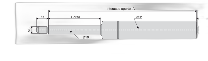 Molla a gas standard con estremita filettate e attacchi separati, stelo Ø10 mm e cilindro Ø22 mm. Corsa 300mm, interasse 666mm, carico 250-400N.