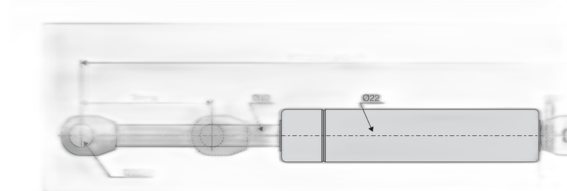 Molla a gas standard con occhielli saldati, stelo Ø10 mm e cilindro Ø22 mm. Corsa 250mm, interasse 615mm, carico 250-400N.