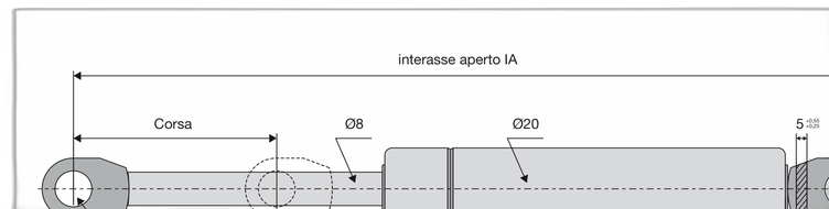 Molla a gas standard con occhielli saldati, stelo Ø8 mm e cilindro Ø20 mm. Corsa 100mm, interasse 288mm, carico 100-250N.